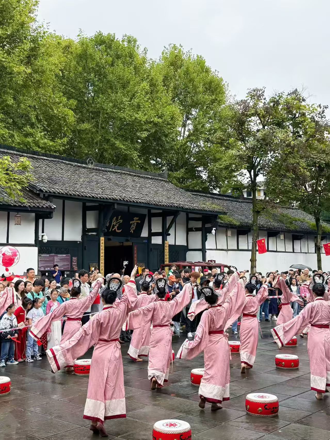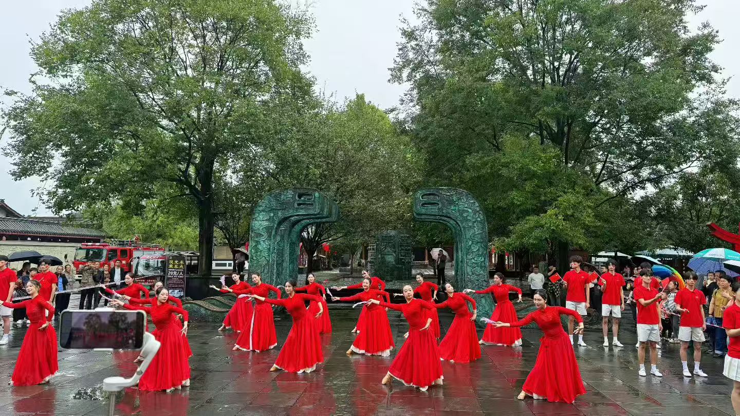 与此同时,贡院广场上一场爱国主题快闪活动温情上演。悠扬的民族乐器合奏,奏响对祖国的深情祝福,汉服红绸舞衣袂飘飘,跳出新时代青年的蓬勃朝气,现场游客纷纷参与其中,齐声歌唱表达对祖国的热爱。