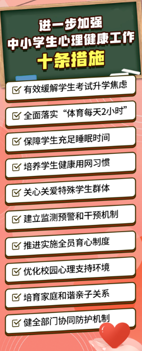 近日,教育部印发通知,出台《进一步加强中小学生心理健康工作十条措施》。通知如下: 进一步加强中小学生心理健康工作十条措施 为落实健康第一教育理念,进一步提高中小学生心理健康工作水平,针对中小学生心理健康阶段性特点和突出问题,制定以下工作措施。 ■ 有效缓解学生考试升学焦虑 减轻学生过重作业负担,严控书面作业总量,严禁布置机械重复、惩罚性作业,鼓励每周设置一天“无作业日”。规范考试管理,减少日常测试频次,合理设置考试难度,不得以考试成绩对学生进行排名。巩固校外培训治理成果,继续严控义务教育阶段学科类培训,规范非学科类培训,加强学科类隐形变异培训防范治理。有序推进中考改革,加快扩大优质高中招生指标到校,开展均衡派位招生试点,缓解学生和家长升学焦虑。全面落实生命安全与健康教育进中小学课程教材指南,每月至少开展一次综合性教育实践活动,加强学生生命教育、青春期教育和挫折教育,提升学生适应环境、调适情绪、应对压力等方面能力,增强心理韧性和心理免疫力。 ■ 全面落实“体育每天2小时” 全面推行中小学生每天综合体育活动时间不低于2小时,保证义务教育阶段全体学生能够按规定课时开展体育锻炼,普遍开展“班级赛”“年级赛”等全员性体育比赛活动,打造“能出汗”的体育课。鼓励学校与社区合作开放周边运动场馆,为学生放学后开展体育锻炼提供场所保障。鼓励推行“课间15分钟”,延长学生课间活动时间,丰富课后服务体育项目,增加学生户外活动时长。开展健康学校建设试点,探索一揽子解决近视、肥胖、心理健康等学生身心健康突出问题的有效机制模式。 ■ 保障学生充足睡眠时间 合理安排学校上下学时间,不得要求学生提前到校参加统一教学活动,有条件的学校应保障学生必要的午休时间。多种途径普及科学睡眠知识,指导家长制定科学的作息时间表,教育学生养成良好睡眠卫生习惯,保障每天充足睡眠时间。严格执行睡眠管理规定,坚决遏制超时学习等违规行为,防止学业过重、无序竞争挤占睡眠时间。将学生睡眠状况纳入学生体质健康监测和教育质量评价监测体系。 ■ 培养学生健康用网习惯 加强学生网络素养教育,培养学生网络安全和网络法治意识,帮助学生养成良好用网习惯。规范管理学生带入学校的智能终端产品,严禁将手机等电子产品带入课堂。鼓励学生和家长共同开展“息屏行动”,减少对网络过度依赖。会同有关部门压实网站平台监管责任,优化算法推荐机制,不得向学生推送危害心理健康的各类信息,坚决遏制“贩卖焦虑”“诱导内卷”等违规行为。持续净化未成年人网络环境,推广应用“未成年人模式”,加强动漫、短视频、微短剧、网络综艺和网络游戏、网络文学等管理。 ■ 关心关爱特殊学生群体 针对留守儿童、流动儿童、孤儿、事实无人抚养儿童以及单亲家庭儿童等特殊学生群体建档立卡,“一生一策”加强心理健康指导。在开学、考试、假期、升学等时间节点,密切关注特殊学生群体情绪和行为变化,针对性开展心理状况研判、个体心理辅导和情感关怀。与学生家长或监护人保持常态化联系,对特殊学生群体每学期至少开展1次家访,及时掌握心理变化和家庭关系情况。深化实施“爱心妈妈”结对关爱留守困境儿童等行动。支持寄宿制学校改善生活条件,加强对寄宿学生的生活照料和安全管护,提升学校管理人员、生活教师的关爱服务水平。 ■ 建立监测预警和干预机制 推进建设全国学生心理健康监测预警系统,每年组织开展1次心理健康抽样监测。国家义务教育质量监测每年监测学生心理健康状况和工作开展情况。督促指导地方建设监测预警系统,完善心理健康问题及时发现、预警、干预处置机制,推进分级响应模式。统筹规范学生心理健康测评,每名学生每学年接受心理测评一般不超过1次。 ■ 推进实施全员育心制度 开展心理健康教育培训,提升教师“育心”意识和能力,在学科教学中有机融入心理健康教育内容,提高对学生心理行为偏常的识别和早期干预能力。配齐配强专职心理健康教师、校医和保健教师,定期开展职业技能培训,发挥专业引领作用。构建班主任、专兼职心理健康教师、精神科医师三级心理健康服务体系,开展接力式服务。建立心理健康教育教研制度,县级教研机构配备心理教研员。鼓励有条件的学校引进社会工作专业人员开展心理与社会支持服务。 ■ 优化校园心理支持环境 实施中小学“护苗行动”,及时化解学生间存在的矛盾冲突,坚决防止各类学生欺凌行为。开展“和谐校园”“友善班级”“温馨宿舍”建设,加强集体教育,营造团结友爱的集体氛围。发挥班(团)干部、心理委员、宿舍长等作用,鼓励开展朋辈帮扶。学校普遍建立心理健康类、艺体类、科技类、实践类、志愿服务类等兴趣小组和学生社团,常态化组织集体活动,培养学生广泛兴趣爱好,推动“生生有社团”。利用人工智能等现代信息技术赋能学生心理健康工作,支持地方探索开发“AI心理助手”“智能减压室”,为学生提供心理问题初步识别、即时心理支持和情绪疏导等。加强教师心理健康支持体系建设,减轻教师工作负担,及时做好教职工心理调适和情绪关怀。鼓励有资质的社会力量、专业医疗机构,为教师开展心理辅导实训提供支持