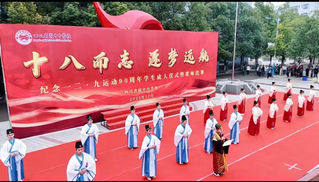 12月9日上午,阆中中学校“十八而志 逐梦远航——纪念“一二·九”运动90周年学生成人仪式”暨歌咏比赛启幕,800余名高2023级学子在老师与家长的共同见证下,宣告正式步入成年。