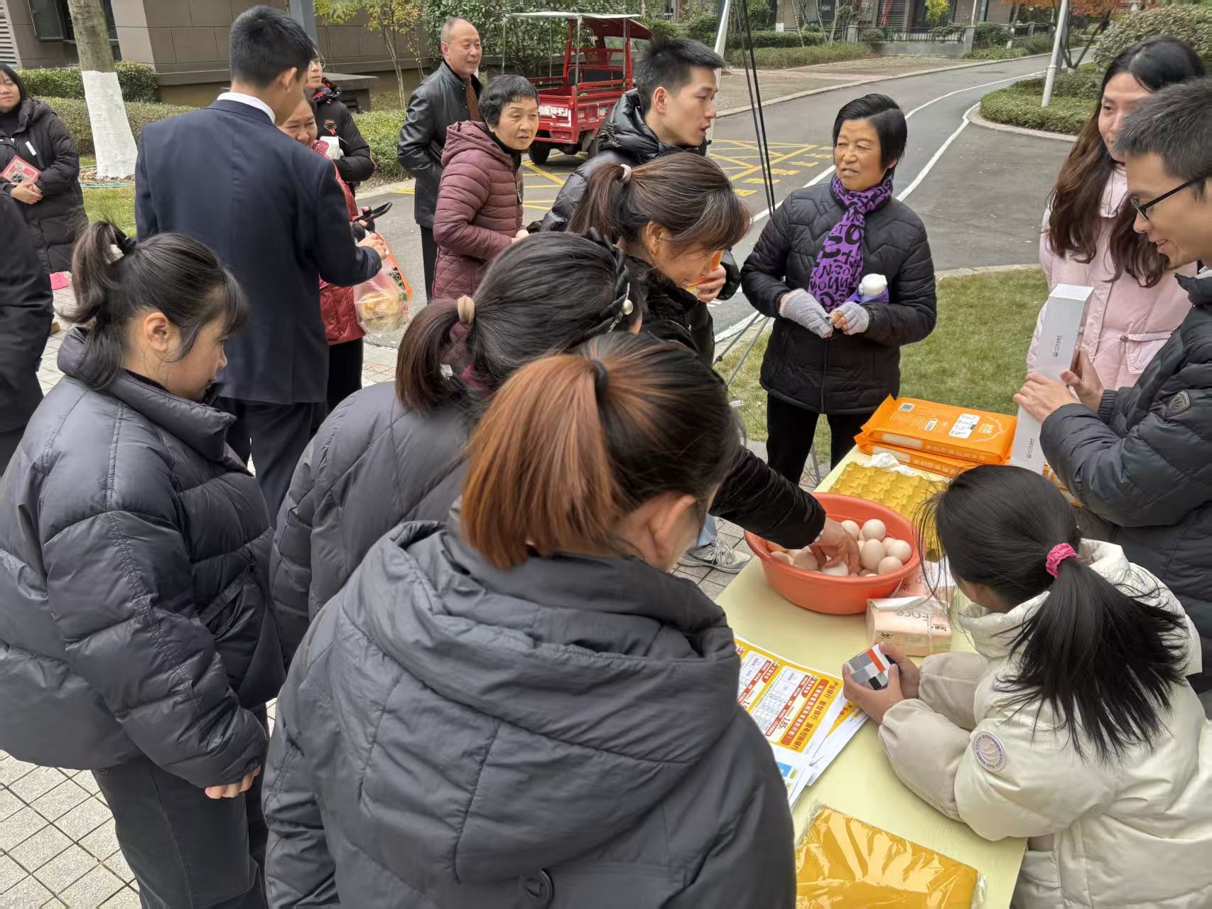 活动现场,“免费抓鸡蛋”区域成为了焦点。满满一筐新鲜鸡蛋整齐摆放,等待着居民们大展身手。规则简单易懂,居民们只需伸手抓取,抓到多少就能免费带走多少。这一趣味十足的活动瞬间点燃了大家的热情,男女老少纷纷排队参与,现场欢声笑语不断。