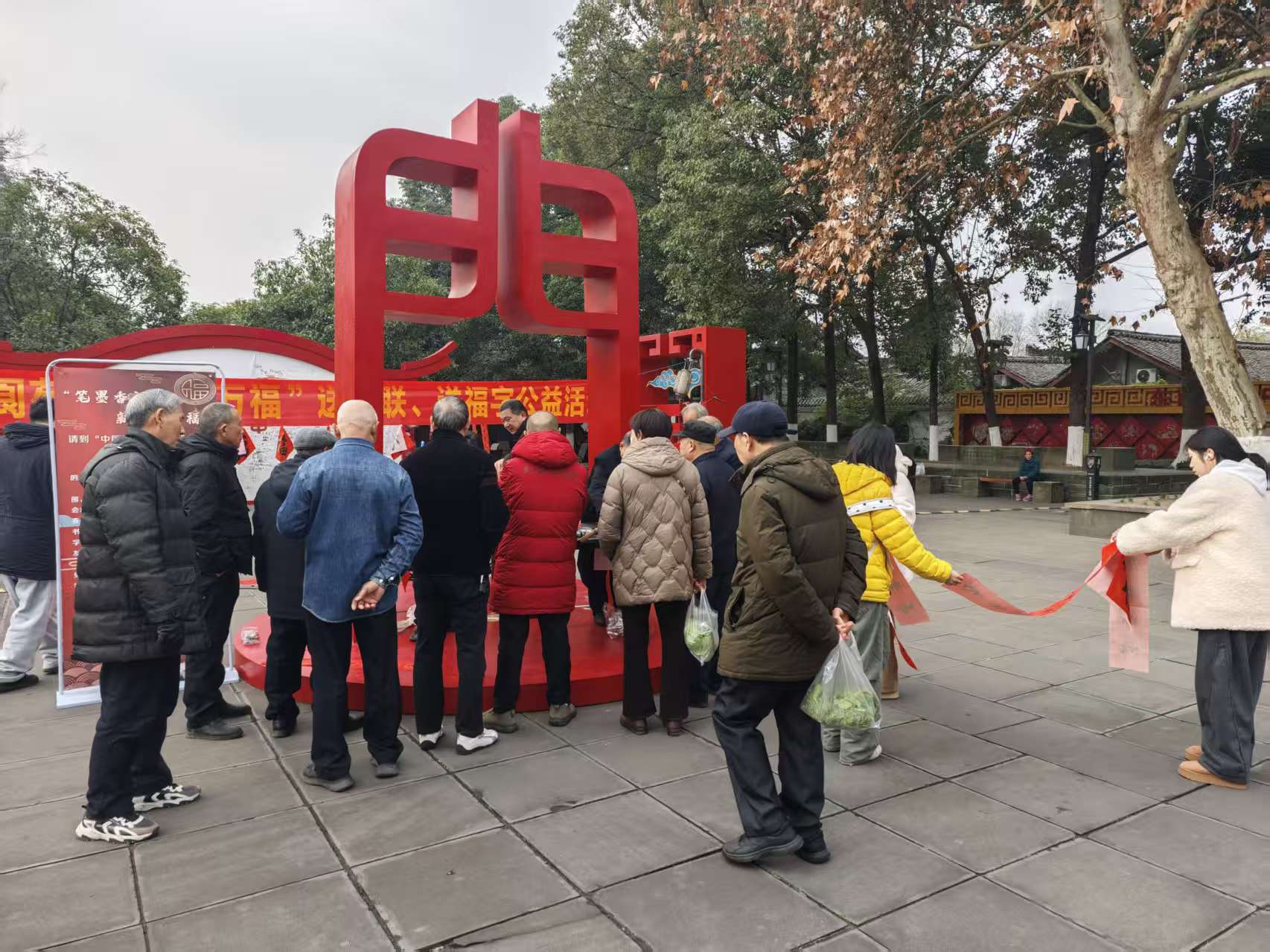 活动现场,前来免费领取春联的市民与游客络绎不绝。人们拿到心仪的春联后,便小心翼翼地将其铺展开来,一边耐心等待墨迹晾干,一边细细品味字里行间流淌的祝福。