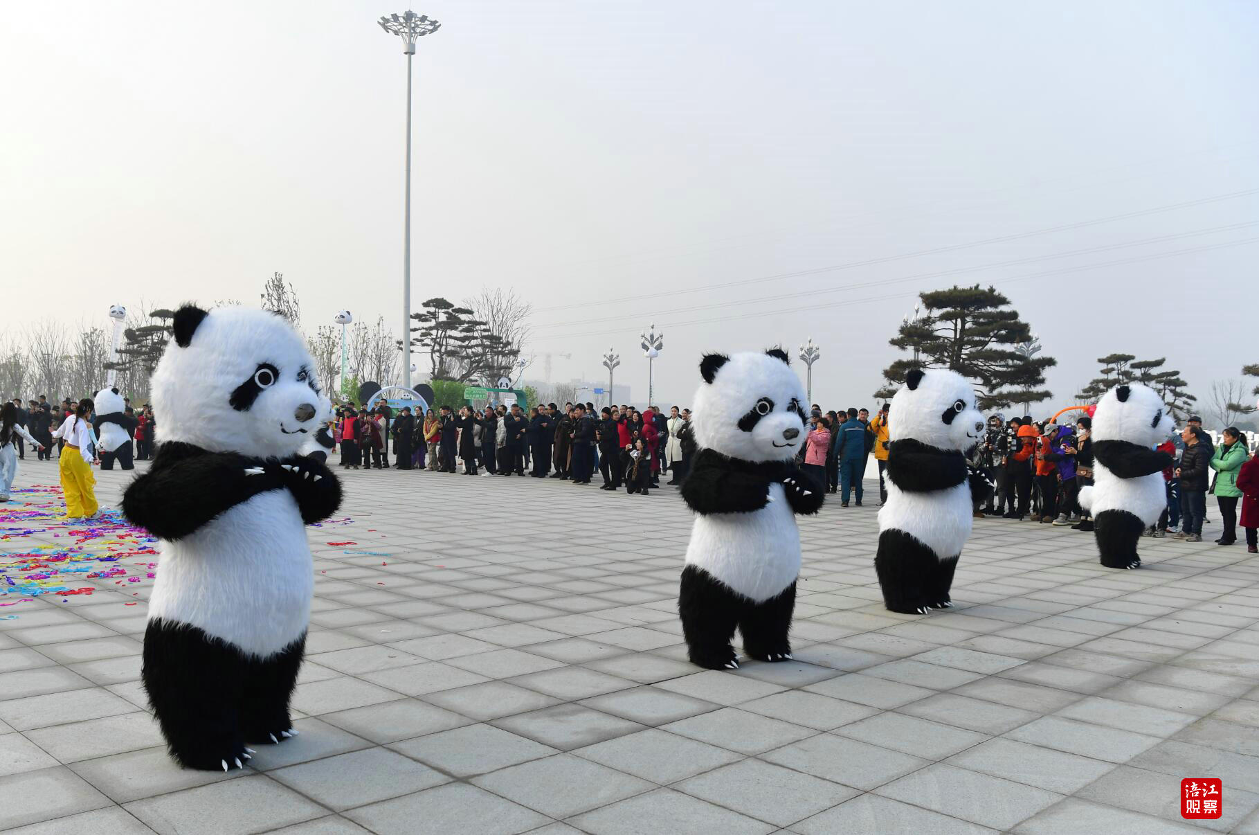 “奇妙巡游”中,可爱的充气熊猫人偶与游客亲切互动,合影留念;