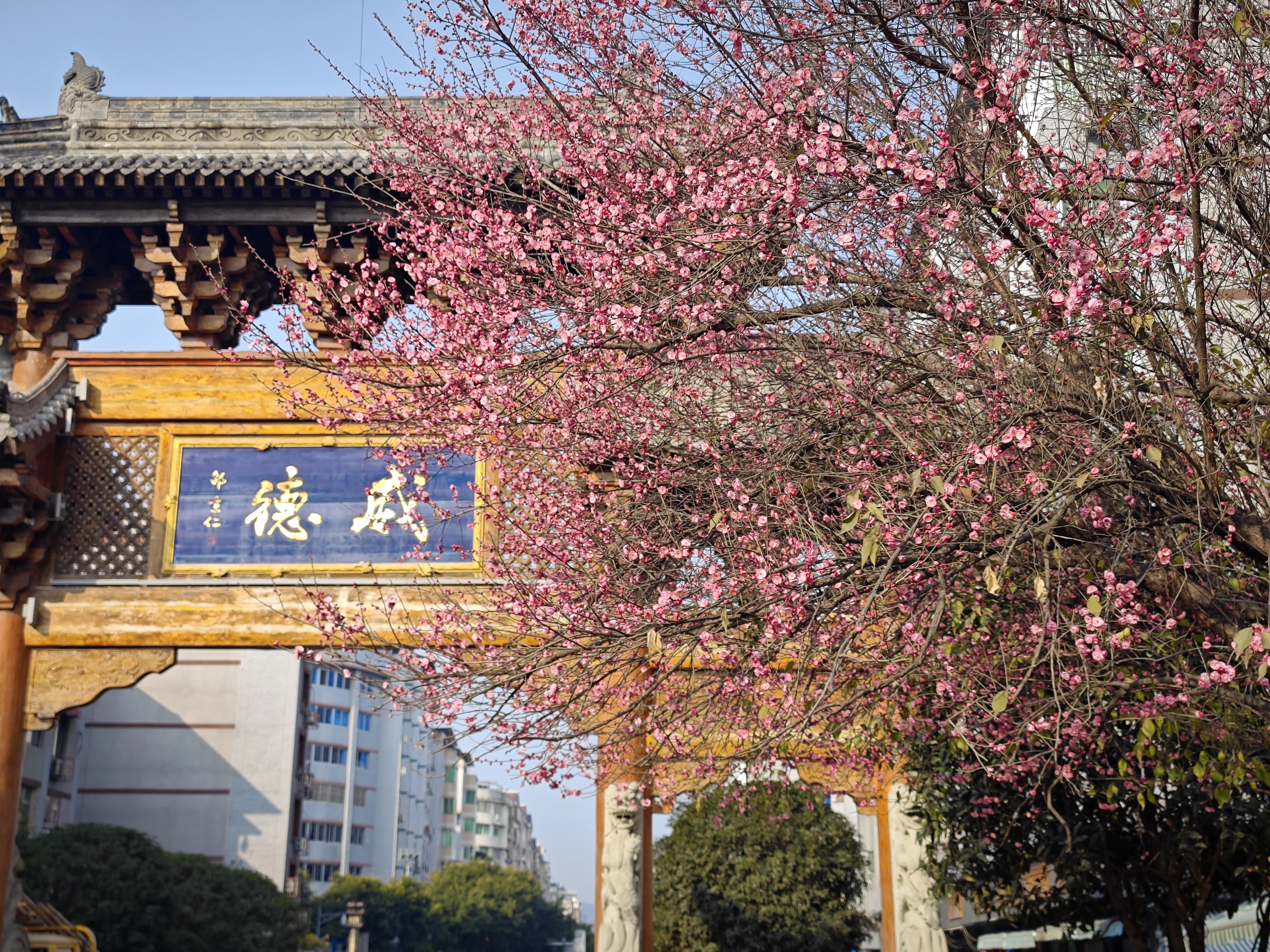暖阳透过梅树枝桠,落在威德牌坊的雕梁画栋上,花影与光影摇曳交织。