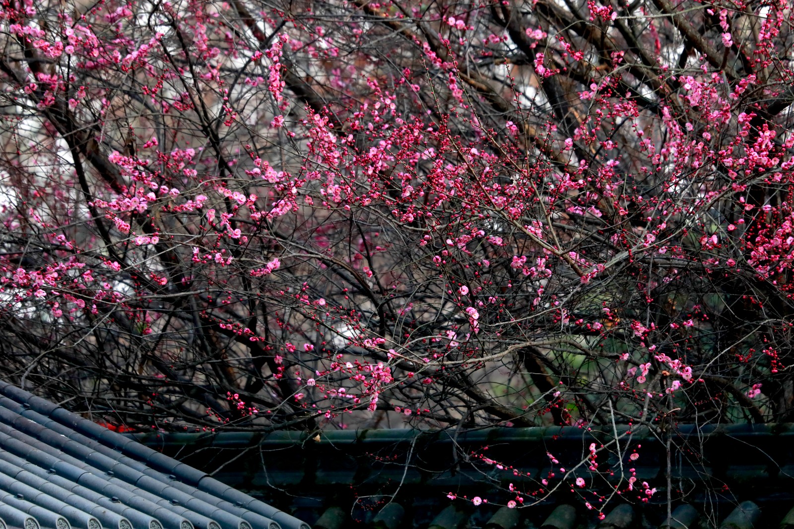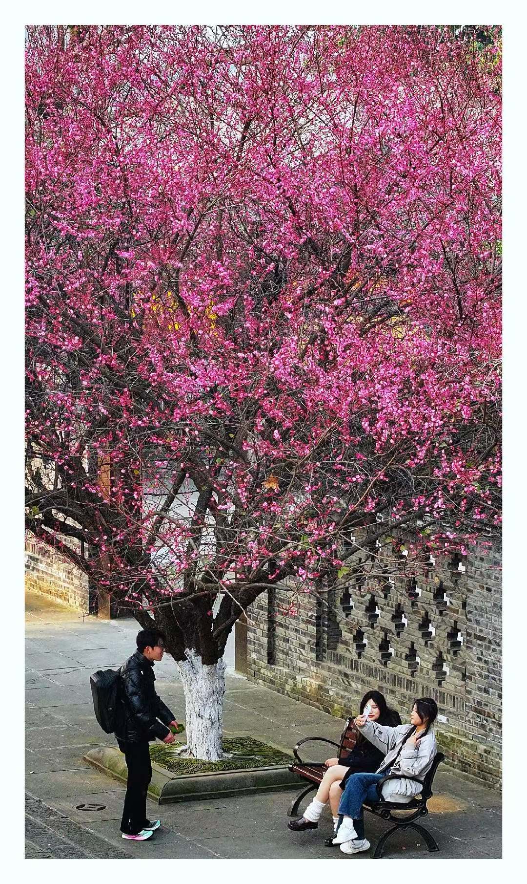 优学园旁的几株梅树上,玫红的花朵簇拥在墙头,瓣瓣娇艳,随手一拍皆是古风盎然的赏梅图景。暗香浮动,疏影横斜,不少市民趁着晴好天气,漫步梅树下,感受冬日的静谧与雅致。