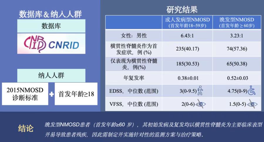 市人民医院神经内科副主任医师蒲亚岚:这项研究一共纳入748例成年以后发病的视神经脊髓炎患者,通过生存分析、回归分析以及桑基图,对这些患者的临床型的转变进行分析,我们首次系统揭示了60岁以上的视神经脊髓炎首次发病的患者,他们独特的临床特征和愈后的规律。