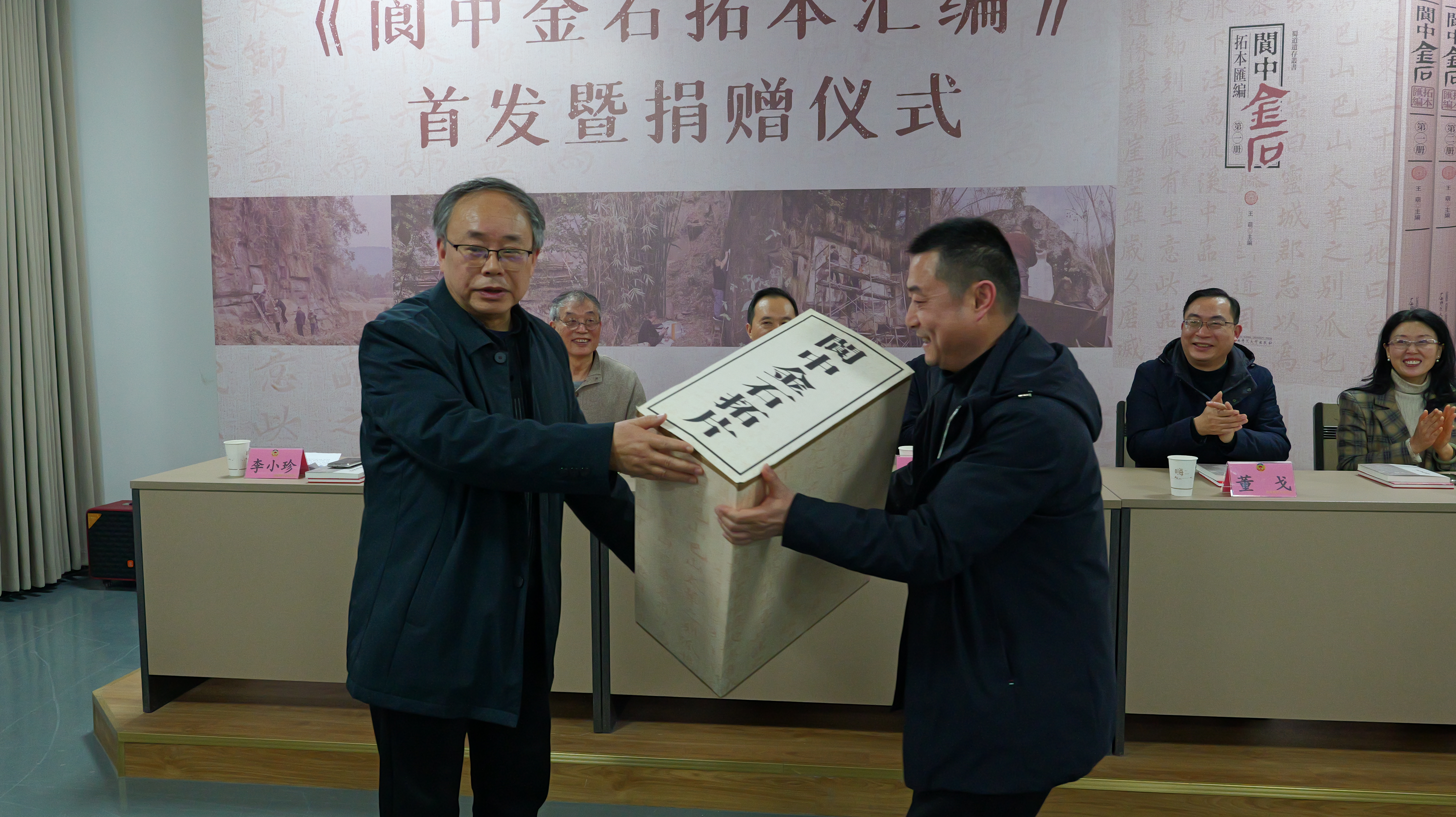 《阆中金石拓本汇编》编辑委员会向南充文化旅游职业学院、西华师范大学蜀道研究院、阆中古管局、市委办、市人大办、市政府办、市政协办等单位赠送了《阆中金石拓本汇编》,受赠单位代表接受赠书。随后,阆中金石田野调查小组将全部拓片原件捐赠给市档案馆。