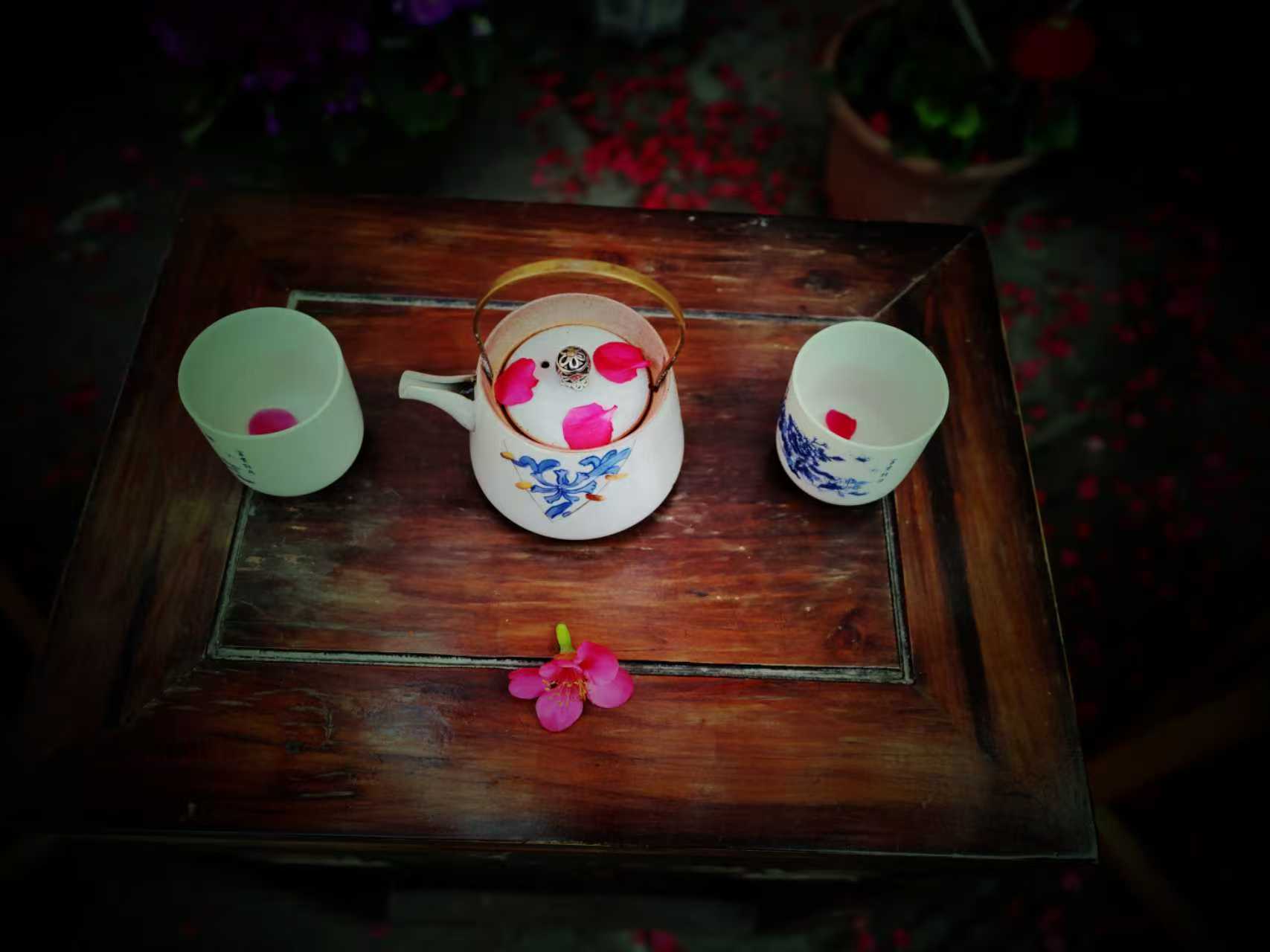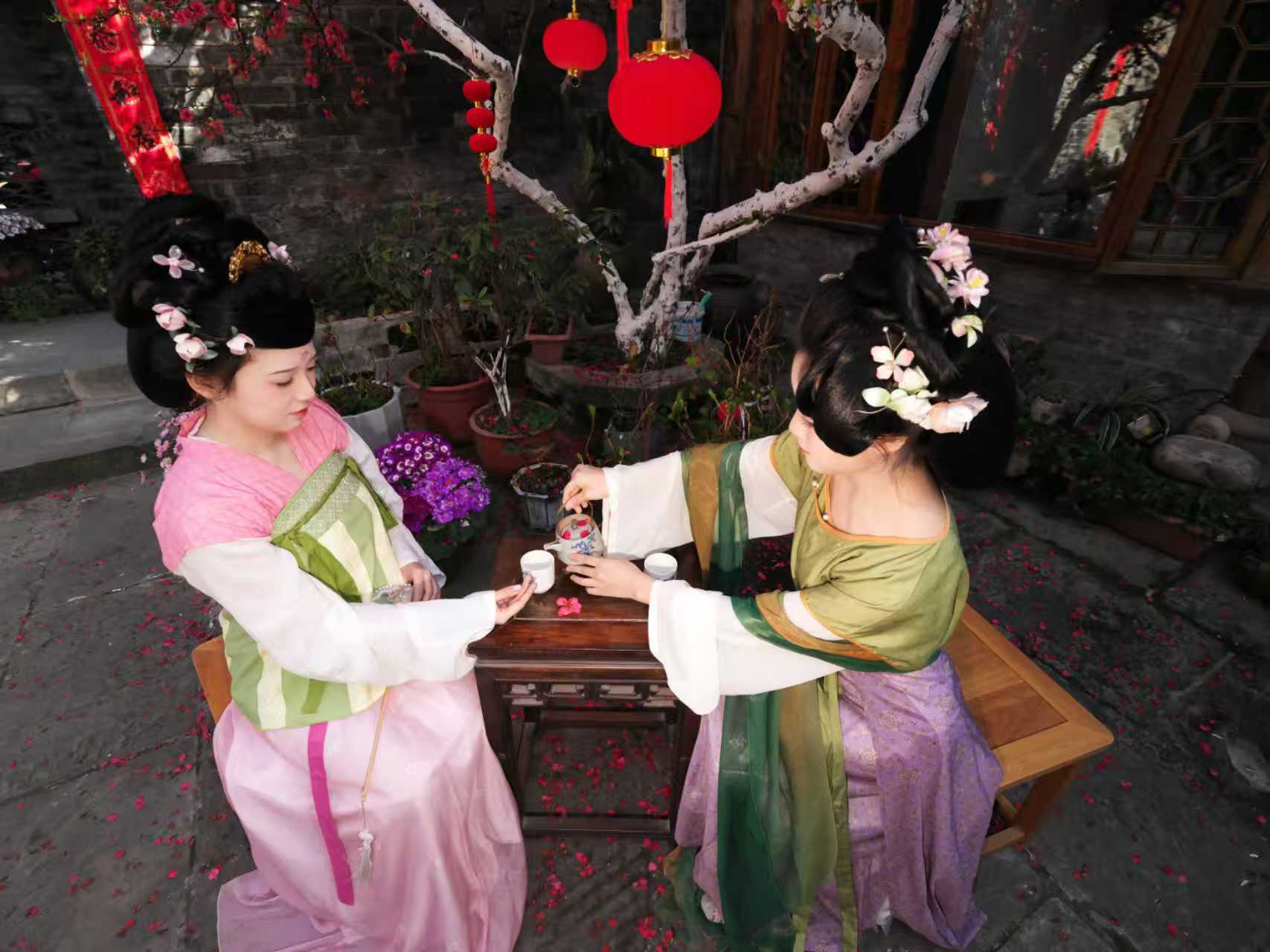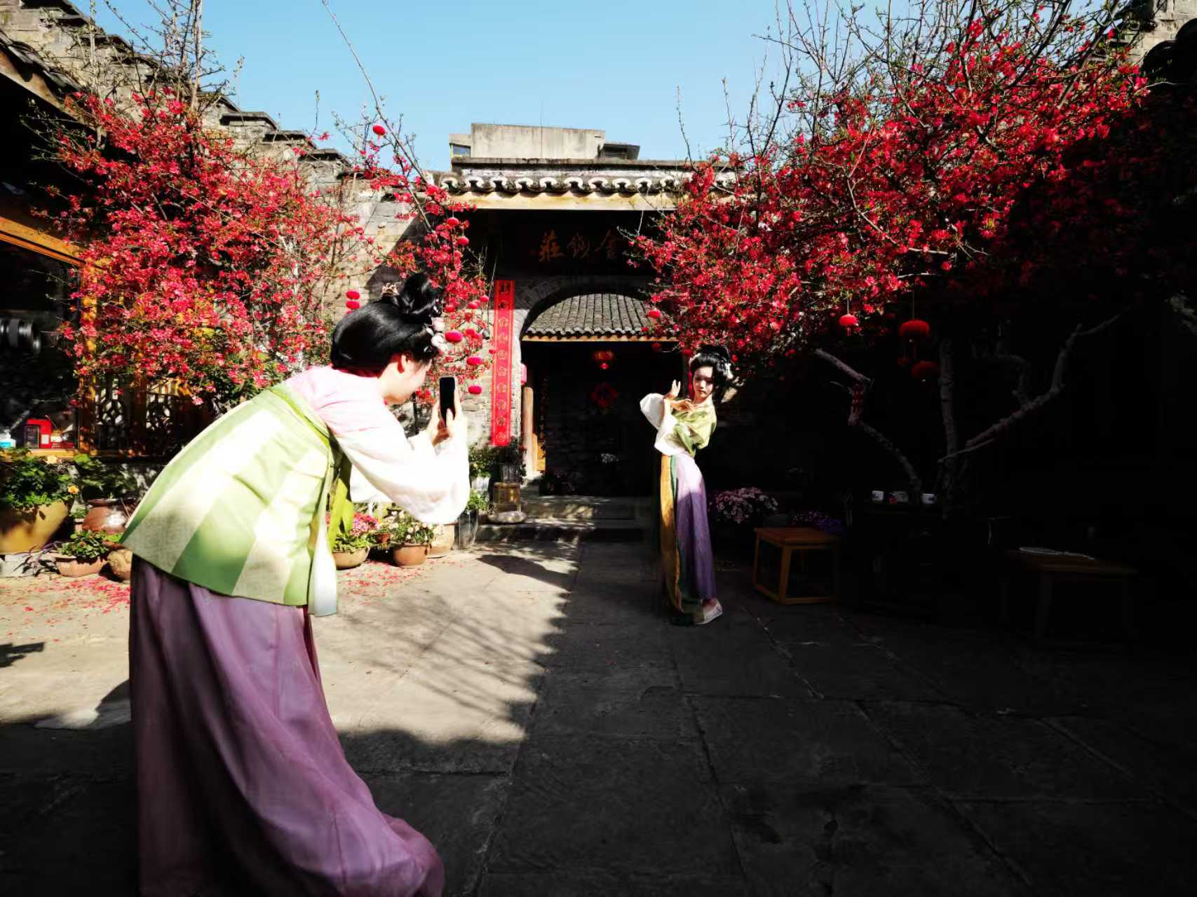 海棠的美,也成了拍客们镜头里的宝藏。每到花期,土生金便迎来无数摄影爱好者,汉服爱好者,他们背着相机,带上道具,穿梭在花影间,定格海棠与老宅的相遇。阳光透过花枝,洒下斑驳光影,花瓣上的露珠晶莹剔透,在花丛中,只听见蜜蜂忙碌的工作声和花瓣飘落触碰到叶子的声音,马头墙的轮廓与繁花相映,每一张照片都藏着古城的诗意与春日的浪漫。无需刻意取景,无需精心雕琢,海棠花自带温柔滤镜,把百年钱庄的古韵与春日生机,揉进每一个镜头里。院子里两张茶桌,八个小凳,只要摄影师说需要搬至那个位置,王建华和院子里的工作人员便会不厌其烦的当好搬运工,当好群众演员,打打下手助力每一次拍摄都会成功。
