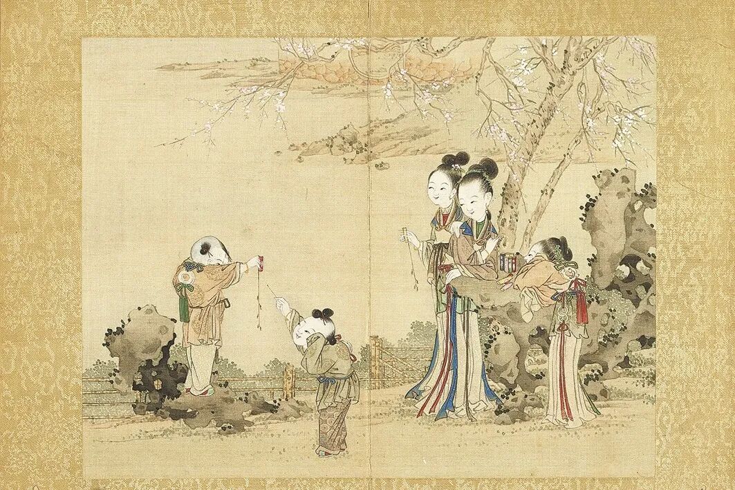 清代佚名画作《升平乐事图册》,描绘一众妇女儿童于庭院间点花灯、燃鞭炮、放风筝、转魁星等节日活动情景。画作描绘十分细腻,女子言笑晏晏、挈儿将女,儿童健硕活泼、天真烂漫。画中的象灯、鹅灯、鹤灯、兔灯、鹿灯和蝙蝠风筝、魁星、钟馗,都是寓意升平乐事的福瑞元素,祥和欢乐、和美融洽,传递着人们对健康、平安、成长和希望的祈祷和期盼。