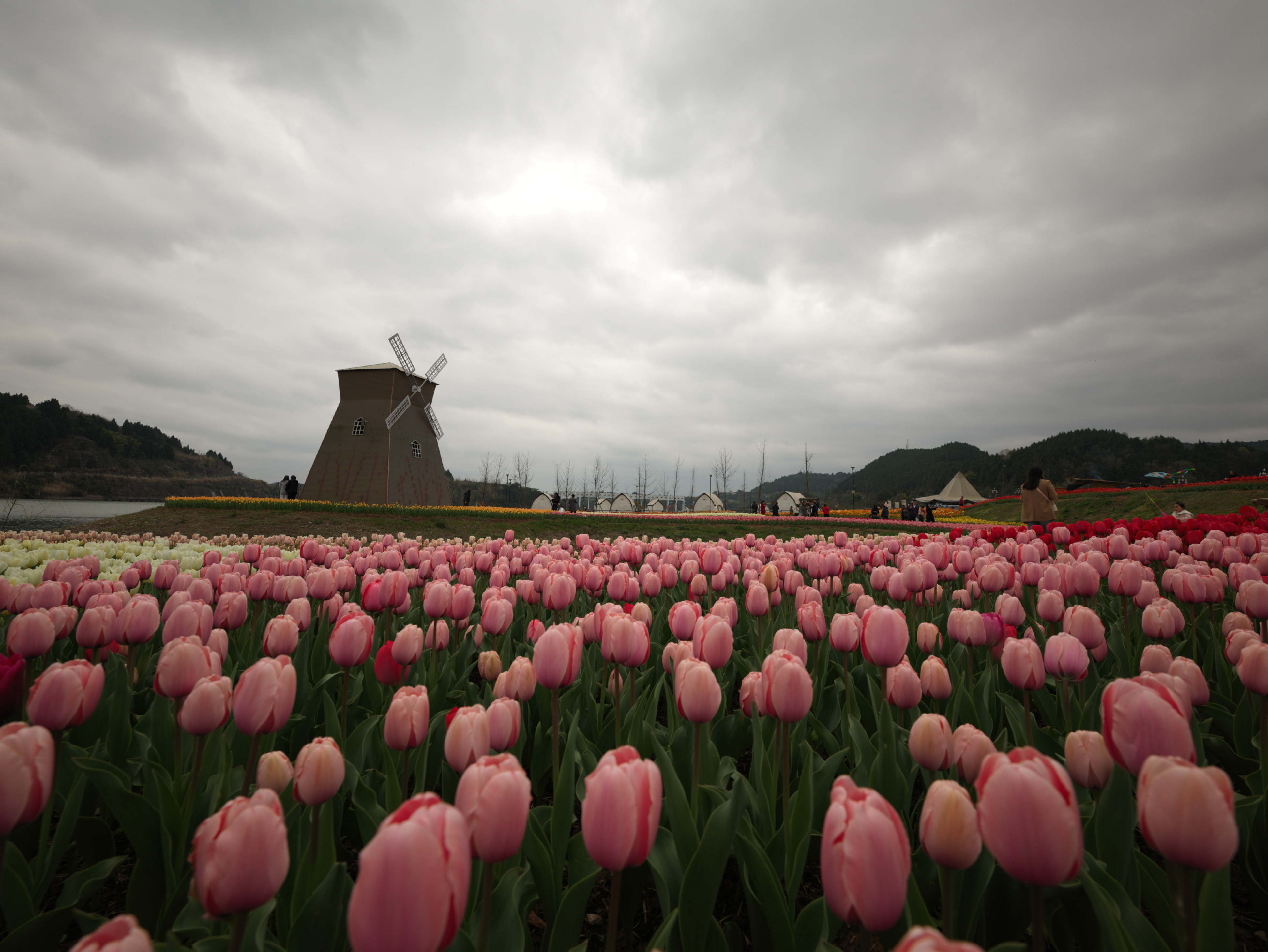 走进躺平岛,最先映入眼帘的便是成片的郁金香和异域风情的风车。红的热烈、黄的明媚、粉的温柔、紫的典雅,层层叠叠的花瓣裹着清甜的花香,在春风里轻轻摇曳,像是大自然精心铺就的彩色绒毯,阳光透过花枝洒下斑驳的光影,连空气里都弥漫着春日独有的清新与香甜。