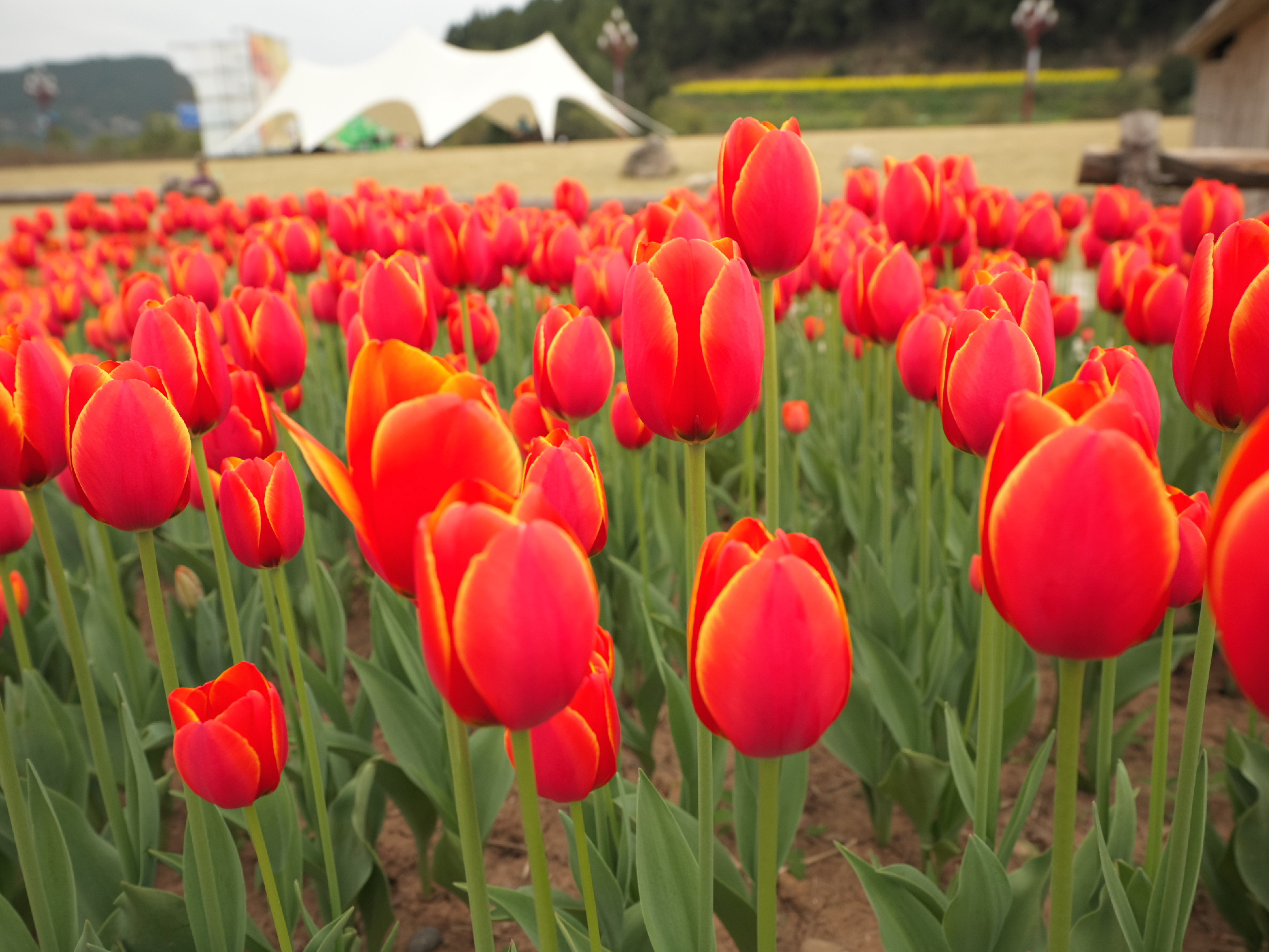 不远处,虞美人舒展着轻薄的花瓣,随风起舞,身姿轻盈如蝶;格桑花星星点点缀在草坪间,朴素又烂漫,三种花儿相映成趣,把整座小岛装点得如梦似幻,远处的风车矗立,远远地陪伴着花海,既是花的“绿叶”,又和它们融合在一起成为风景。没有城市的车水马龙,没有工作的琐碎烦恼,躺平岛的春天,主打一个自在随心。江畔的草坪上,早早支起了各式白色的帐篷与天幕,一家人围坐在一起,摆上零食水果,泡一壶清茶,看孩童在花丛边追逐嬉戏,听长辈聊着家常琐事,欢声笑语随着江风飘向远方。年轻人们则忙着与花海合影,汉服裙摆拂过花瓣,手机镜头定格下每一帧美好,不用刻意摆姿势,随手一拍都是氛围感满满的春日大片。