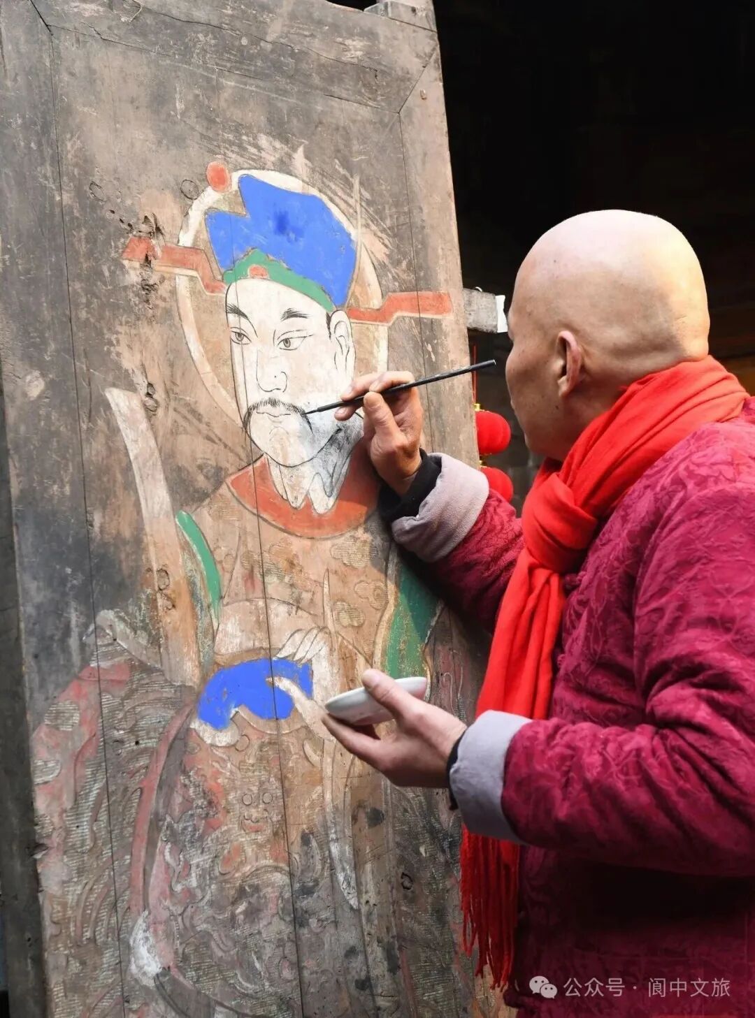 连日来,在位于阆中古城北街的阆中门神画非遗传承基地里,非遗传承人张桅忙个不停。他热情地向来往游客介绍阆中门神画的独特之处:“大多数门神是贴上去的,阆中门神却是直接画在门上,两肩两脚垂直,眼睛明亮有神。”