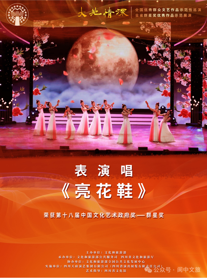 “亮花鞋”这一传统习俗源自阆中市老观镇。经当地精心打磨与创新演绎,先后衍生出舞蹈版与音乐版两个版本,均登上央视舞台。其中,舞蹈版《亮花鞋》亮相央视春晚,惊艳四方;音乐版《亮花鞋》则斩获全国群众文艺领域政府最高奖——群星奖。