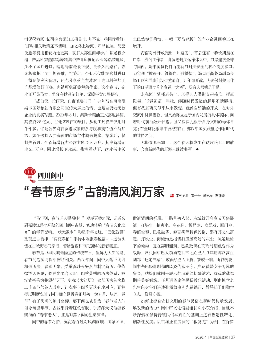 近日,《中国纪检监察杂志》2026年第4期刊发专题报道,聚焦我市依托深厚历史文化底蕴、以 “春节原乡” 古韵涵养廉洁清风的实践探索,详细介绍了这座千年古城将传统文脉与廉洁文化深度融合、让清风正气浸润万家的生动做法。