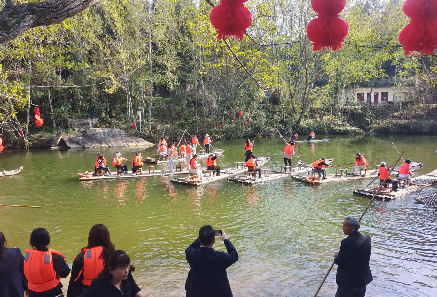 活动期间,教师团队沉浸式体验了我镇特色文旅项目,全方位感受本土自然与人文魅力。在竹筏体验环节,老师们乘上竹筏,顺着蜿蜒河道缓缓前行,两岸青山叠翠、碧波荡漾,原生态的山水风光让大家驻足欣赏、不时交流,亲身感受我镇生态旅游的独特优势;随后,团队走进童龄书院,在古色古香的院落中,认真聆听书院的历史渊源,品读经典典籍,感受国学文化与乡土文脉的深度交融,详细了解书院在传承传统文化、丰富乡村文化生活中的重要作用;最后,大家深入铧厂河村,实地探访传统村落风貌、特色人文遗存,与村负责人亲切交流,详细询问该村在文旅资源保护、乡村旅游开发等方面的实践经验,深入了解我镇文旅融合发展的具体路径。