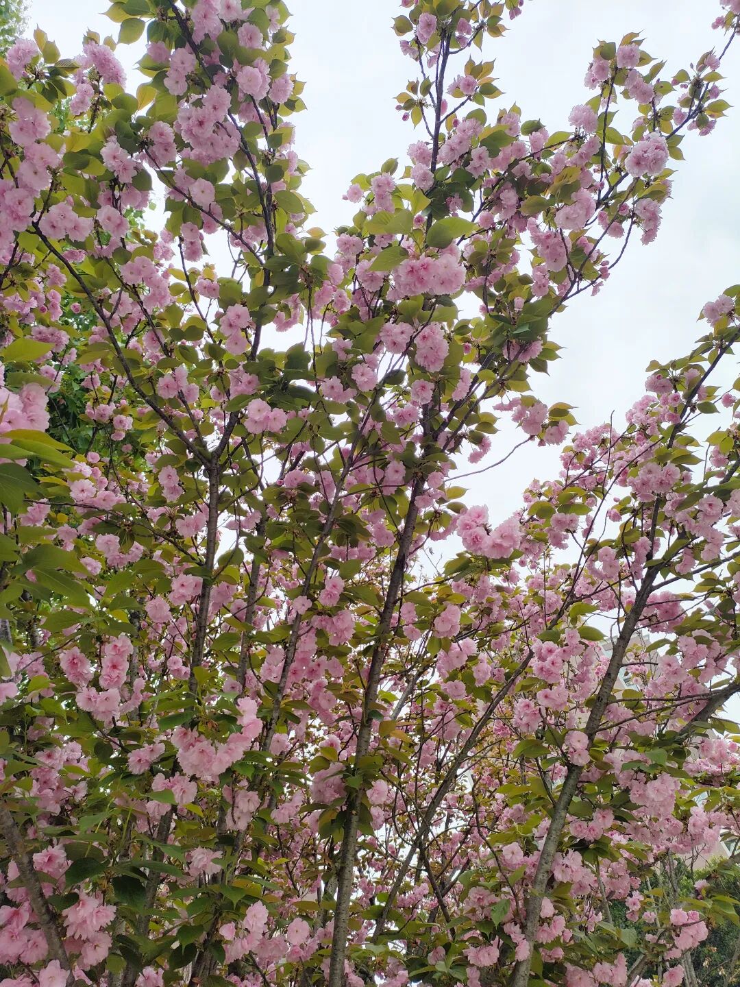 景区内,盛开的樱花主要集中在玉台山腰的游步道两侧及观景平台周边。粉白色的花朵密密匝匝地缀满枝头,微风拂过,花瓣轻盈飘落,宛如一场浪漫的“樱花雨”。游客们或驻足拍照,或漫步于花间小径,孩子们在树下嬉戏,欢声笑语不绝于耳。