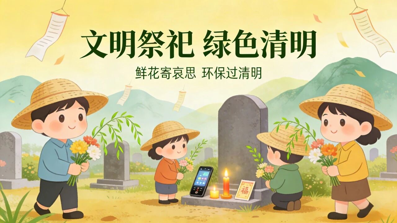 一、文明祭扫,让思念更安全。请您自觉摒弃焚烧纸钱、燃放鞭炮、点香烛等传统陋习,主动践行文明祭扫新风尚,优先选择敬献鲜花、植树寄哀思、网上祭奠、家庭追思会等文明、低碳、安全的祭扫方式。祭扫时做到言行文明,不喧哗吵闹、不随意丢弃垃圾、不破坏墓区植被,既表达对先人的缅怀之情,也守护好我们共同的绿色家园,让清明少一份烟火,多一份清净,少一份杂乱,多一份庄重。