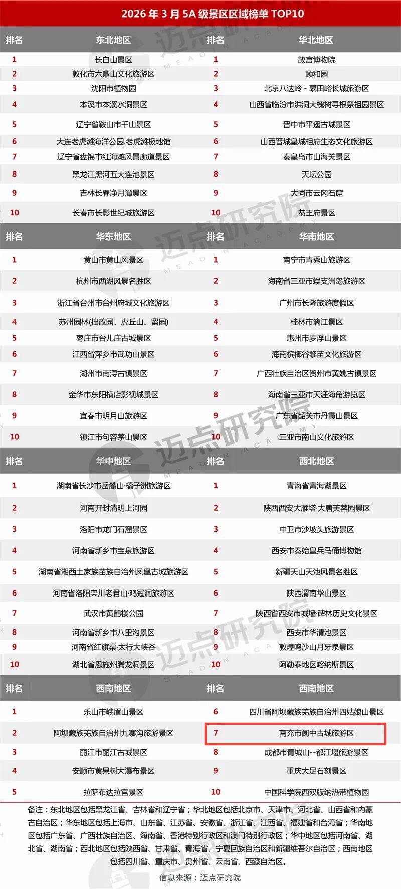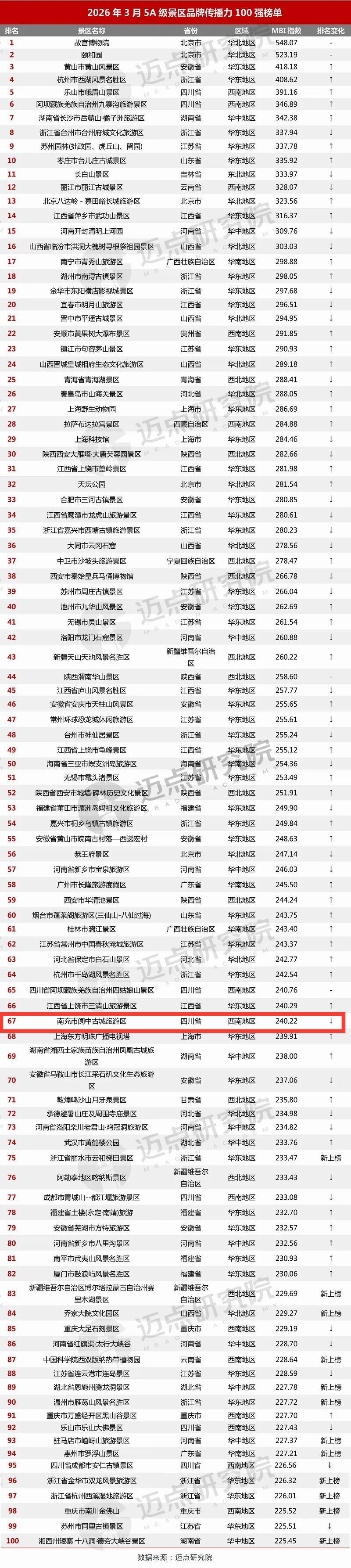 本次榜单依托搜索、点评、运营、媒体四大维度综合测算,三月全国5A级景区整体呈现淡季不淡的市场态势。阆中古城凭借深厚的历史文化底蕴和丰富的春季特色活动,保持了优异的品牌传播表现,与峨眉山、九寨沟等知名景区共同擦亮西南文旅金字招牌。