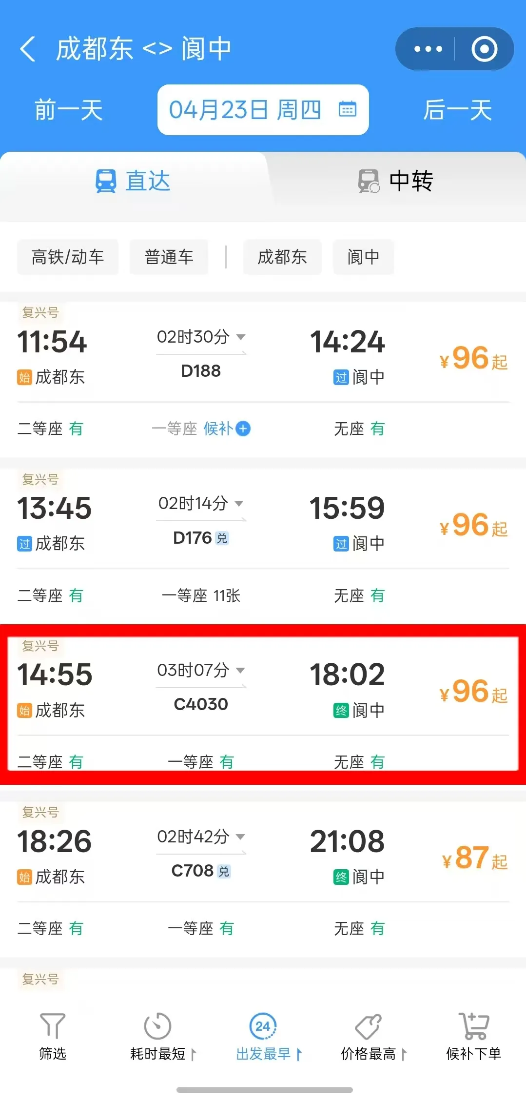 成都东→阆中:C4030/27次,该列车从成都东出发时间为14:55分,抵达阆中站为18:02分,车程约3小时07分钟。
