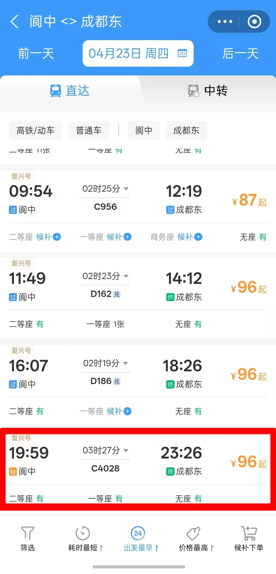 阆中→成都东:C4028/29次,该列车从阆中出发时间为19:59分,抵达成都东站为23:26分,车程约3小时27分钟。