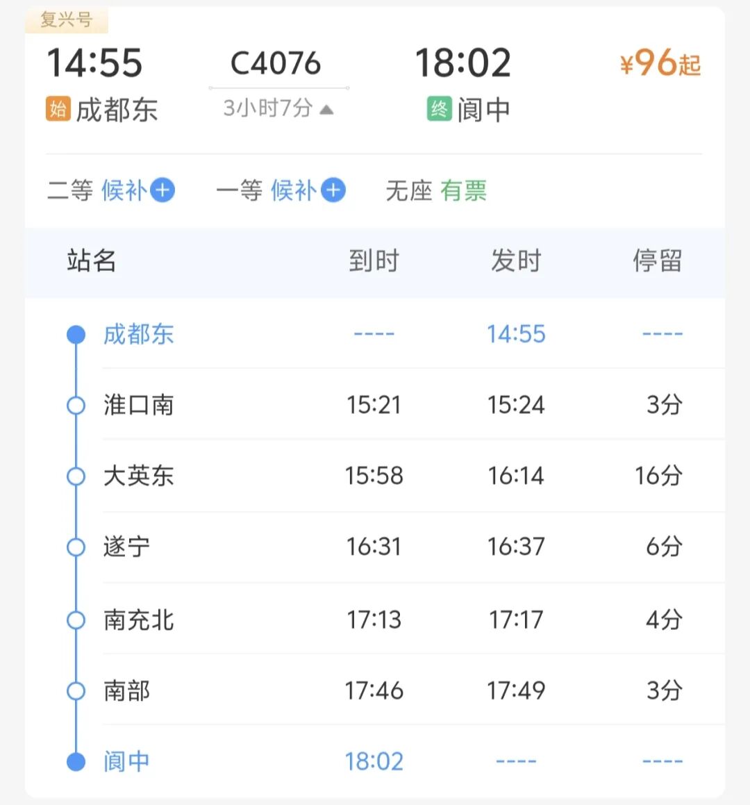 加开日期为4月29日至5月6日。发车时间为14:55,车程共3小时7分钟,预计到达阆中站时间为18:02。