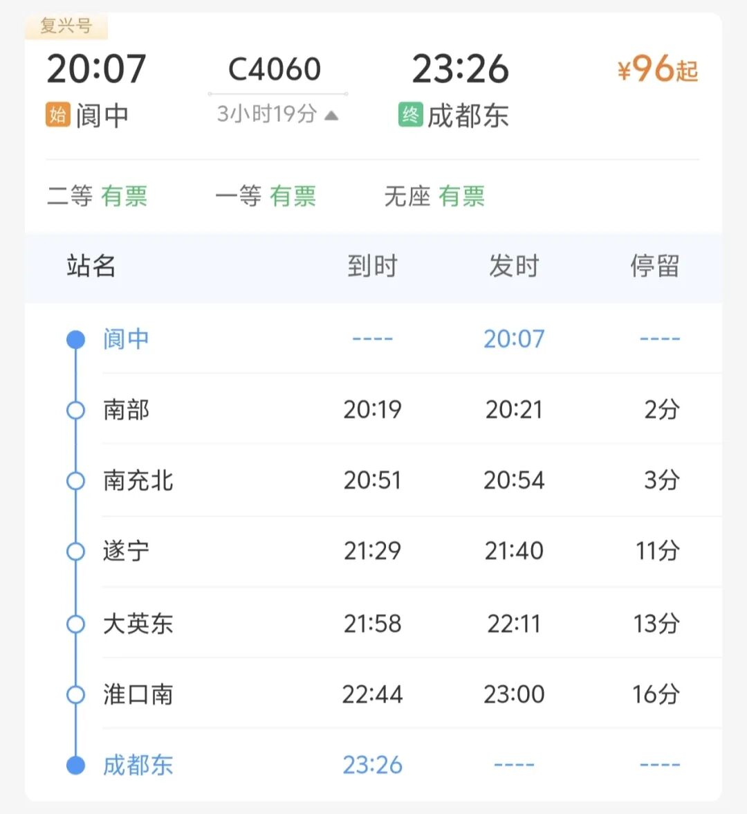 加开日期为4月29日至5月6日。发车时间为20:07,车程共3小时19分钟,预计到达成都东站时间为23:26。
