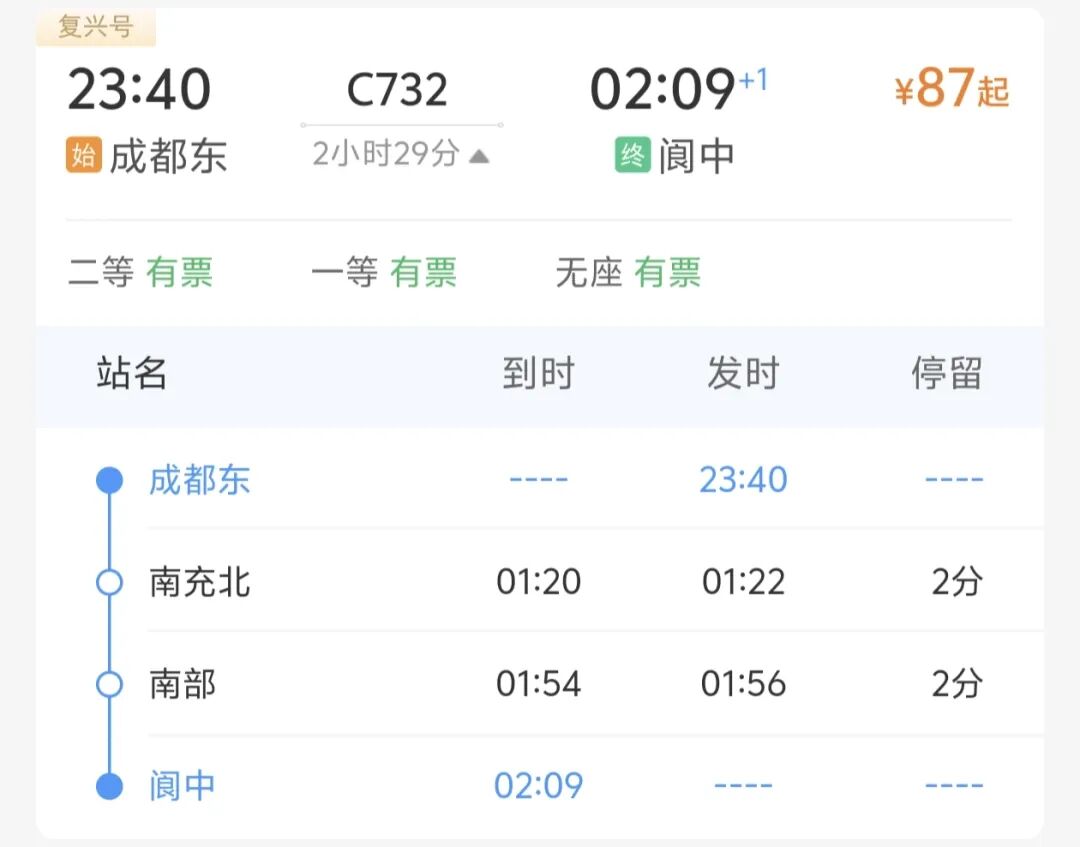 加开日期为5月1日、5月2日、5月5日。发车时间为23:40,车程共2小时29分钟,预计到达阆中站时间为次日02:09。