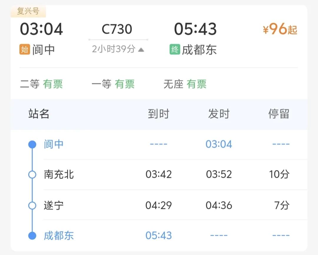 加开日期为5月1日、5月2日、5月5日。发车时间为03:04,车程共2小时39分钟,预计到达成都东站时间为05:43。